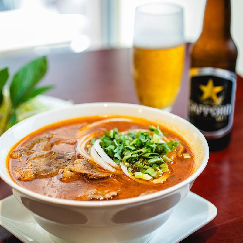 Bò kho | Thick tomato broth, slowly simmered with beef, served with Egg or Rice Noodles, bean sprouts, cilantro and scallions.