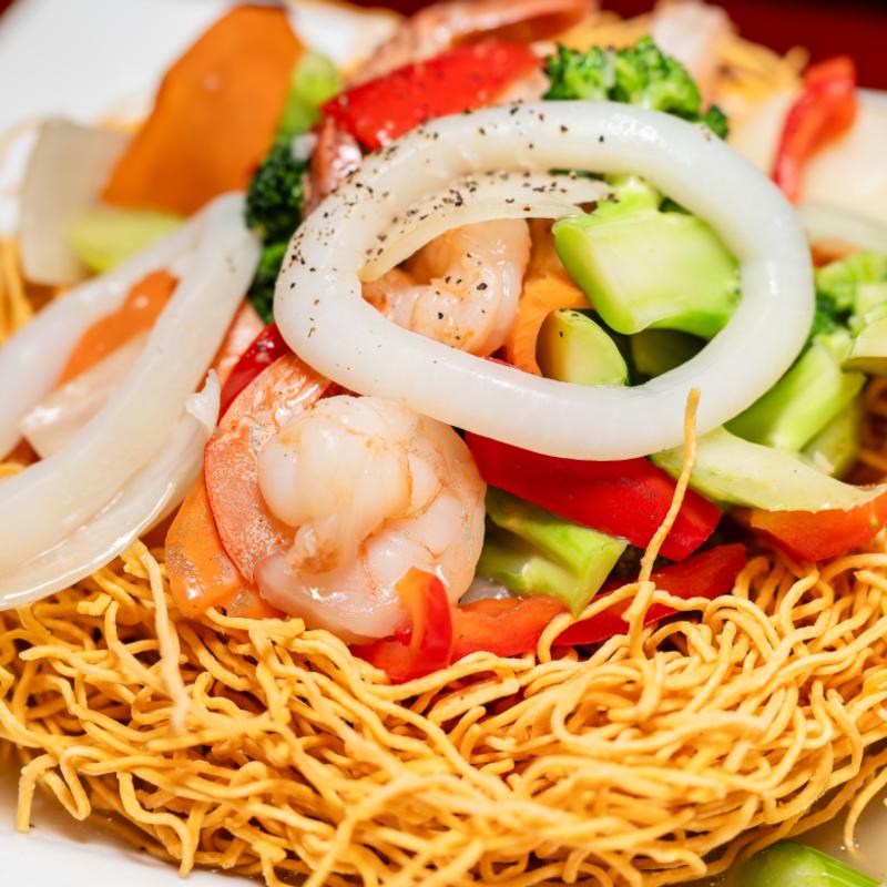 Mì xào dòn | Crisp bed of egg noodles with assorted vegetables stir fried in white garlic sauce.