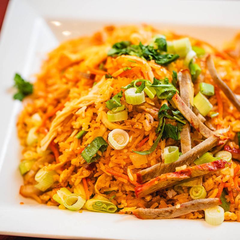 Cơm chiên | Fried rice with eggs, carrots, onions, and scallions.